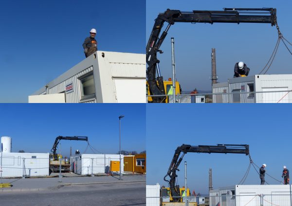 der mensch auf der weißen bauhütte, der etwas rückt und regelt und nicht weiß, was das da werden soll, winkt mir zu. ja, ich darf ihn fotografieren. freundlicher tag also.