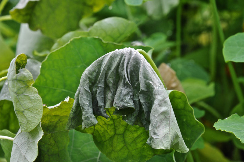 die kapuzinerkresse ist vom frost gebeutelt und ist in die kniee gegangen die blätter hängen herunter wie wäsche von der leine