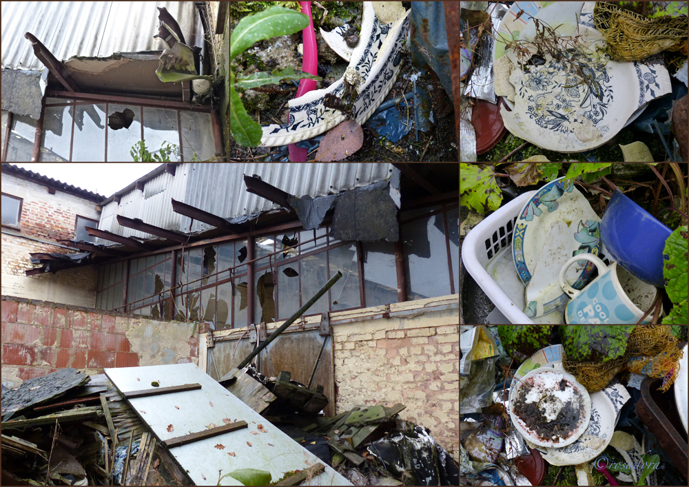 dennoch beeindruckt mich die gewaltige halle. noch steht sie, als wolle sie beachtet und aufgerichtet werden. zerschlagenes geschirr und töpfe – ob hier gekocht wurde, oder nur müll. der kleinkram zwischen den beiden hallen hat seinen reiz. so zwischen schilfkolben und blühendem moos. die natur hat ihr anrecht schon gefunden.
